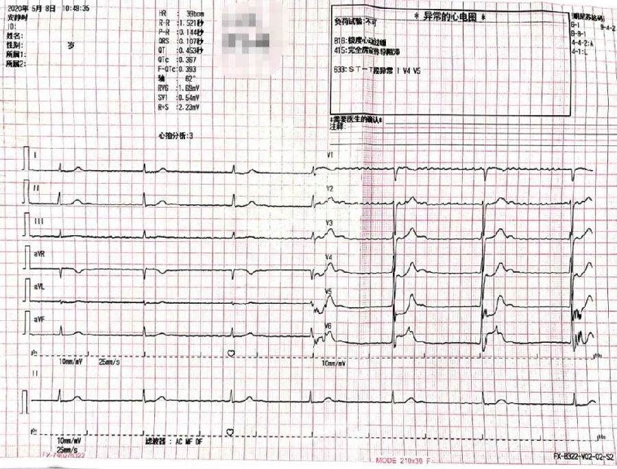 5月8日上午,尹某再次出现胸闷,自觉病情加重,为求进一步诊疗来到漯河市中心医院,经检查发现高度房室传导阻滞已经发展为完全性房室传导阻滞,“24小时平均心跳38次/分,总心搏动只有54589次,已经完全不能满足正常人体生理的需求了。”刘东亮教授说。