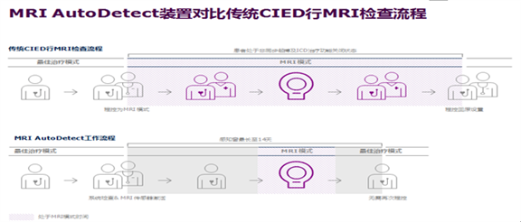 全自动兼容核磁共振(CE3.0T)心脏起搏器在打开14天的自动检测窗口后,磁共振预约可以很灵活,可以执行多次磁共振检查。患者一旦进入核磁共振检查室,起搏器可以感知磁场,在10秒内自动转换为抗磁共振模式,患者结束检查离开核磁共振室后,起搏器自动恢复为日常的起搏模式。这样就能最小化抗核磁模式时间至真正的扫描时间。