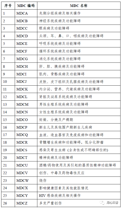 表3 26个主要诊断大类(MDC)
