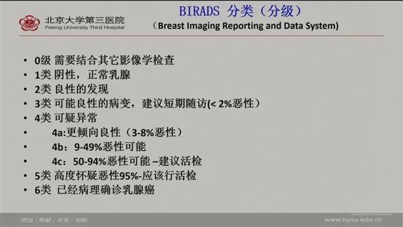 在乳房检查中,问诊常常会出现一些大家比较紧张的情况。例如,超声检查一般会有乳腺结节或者是乳管扩张这样的发现,钼靶主要发现一些钙化或者是不对称稍高密度影。由于现在技术的提高和普及,在检查中经常会发现乳腺结节、乳管扩张等问题,发现了之后也不必特别的紧张,可以根据影像科医生给出的BIRADS分类,大概判断乳腺结节恶性的几率是有多少,然后再决定是否需要手术干预。