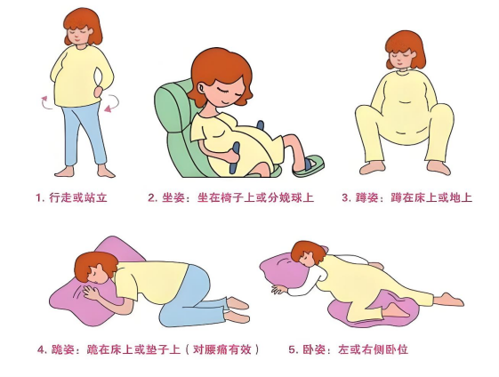 传统的仰卧位使腹主动脉和下腔动脉受到子宫的压迫,造成产妇血液循环不畅,胎盘供血减少,胎儿窘迫和新生儿室息的发生率增加,在第一产程中采取半坐位或是坐位可以解除子宫对下腔静脉、腹主动脉的压迫,使胎儿的血液供应得到大大的改善。还有一种情况:产妇宫口开大了,但是胎头迟迟不肯下降时,可以利用分娩球,家属环抱住产妇,伴随着宫缩来临有节奏地颠球,使胎头顺着重力的作用下降,同时也有助于会阴部肌肉放松。在第二产程,我们也可以采取半坐卧位的分娩方式,通过重力的作用加快产程进展。