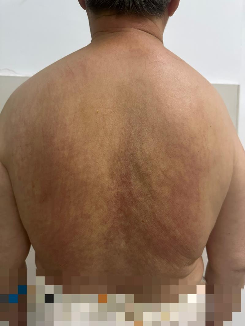 张阿姨说自己在家附近诊所已治疗2月余,发病至今体重下降约2kg,病程中未出现咳嗽、咳痰、咳血等症状。起初因皮疹瘙痒被诊断为“皮炎,”,给予“地塞米松 10mg”肌注,抗组胺药物口服,及止痒类药物外用,瘙痒可短期缓解,但皮疹未见明显消退,停药后再发。后经人介绍至另一诊所就诊,同样考虑是过敏性疾病,给予相关药物对症治疗后,疗效欠佳。2周前因皮疹瘙痒加剧,伴阵发性寒战、低热冷汗,及四肢无力、肌肉酸痛、进食困难,至郑州某中医院皮肤科就诊,完善相关检查,血常规:中性粒细胞百分比 80.3%,淋巴细胞百分比 12.5%,肝功八项:谷丙转氨酶 68.1U/L,谷草转氨酶 158.9U/L,乳酸脱氢酶 513U/L,血沉,C反应蛋白,免疫球蛋白A,免疫球蛋白G,免疫球蛋白M未见异常,中医诊断“特指发热 湿疮”,考虑是肝功能异常引起的皮疹及瘙痒,治疗不详,无效。