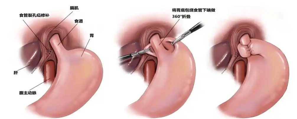 2.外科治疗:外科手术治疗胃食管反流病目标直接而明确:重建那道失守的“抗反流屏障”。手术的原理是医生通过几个微小的孔洞,利用腹腔镜技术,将患者自身的胃底部分包裹在食管下段,人为地再造一个“活瓣”。这个新造的阀门在胃内压力增高时,会被动性地压闭食管,从而物理性地阻止反流;而在吞咽时,食物又能顺利通过。