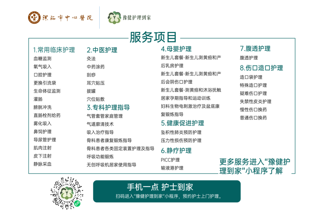 根据国家卫生健康委、国家中医药管理局《关于印发进一步改善护理服务行动计划(2023-2025年)的通知》《河南省护理事业发展规划(2021-2025年)》《关于印发河南省进一步改善护理服务行动计划实施方案(2023-2025年)的通知》等相关文件要求,为进一步满足人民群众多样化、差异化的护理服务需求,漯河市中心医院开通“豫健护理到家”互联网+护理服务,将优质护理服务延伸到“最后一公里”。