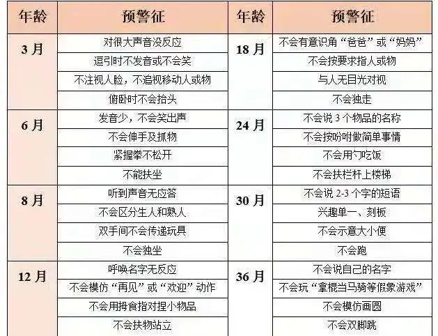 儿童语言发育没有达到与其年龄相符的水平,通常表现为听不懂、不愿说、不会说、词汇少、表达简单等。家长们可以对照下表观察,如果孩子在相应月龄出现以下预警征,就要引起重视。