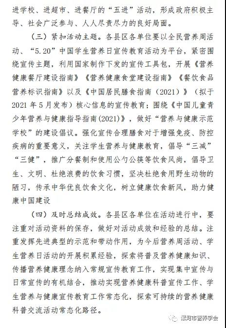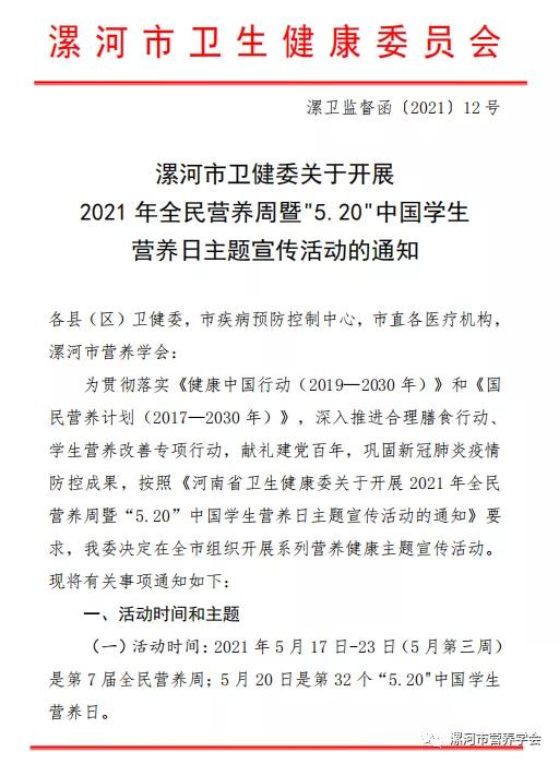 为深入推进合理膳食行动、学生营养改善专项行动,献礼建党百年,巩固新冠肺炎疫情防控成果,按照《漯河市卫生健康委关于开展2021年全民营养周暨“5.20”中国学生营养日主题宣传活动的通知》要求,漯河市营养学拟开展系列营养健康主题宣传活动。