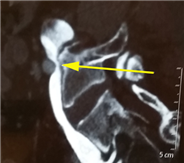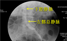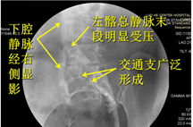 造影示:髂总静脉末段显示弧形压迹,骶骨水平可见迂曲交通支显影