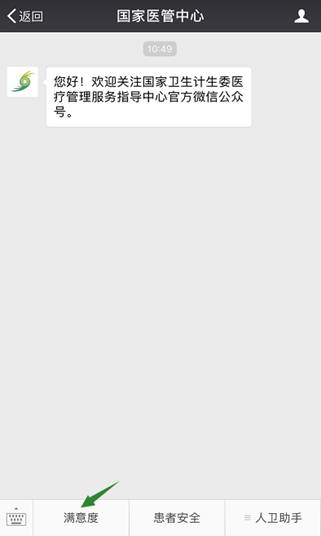 通过关注国家卫生计生委医管中心公众号,您可以匿名填写医院满意度调查问卷,帮助我们改善服务。