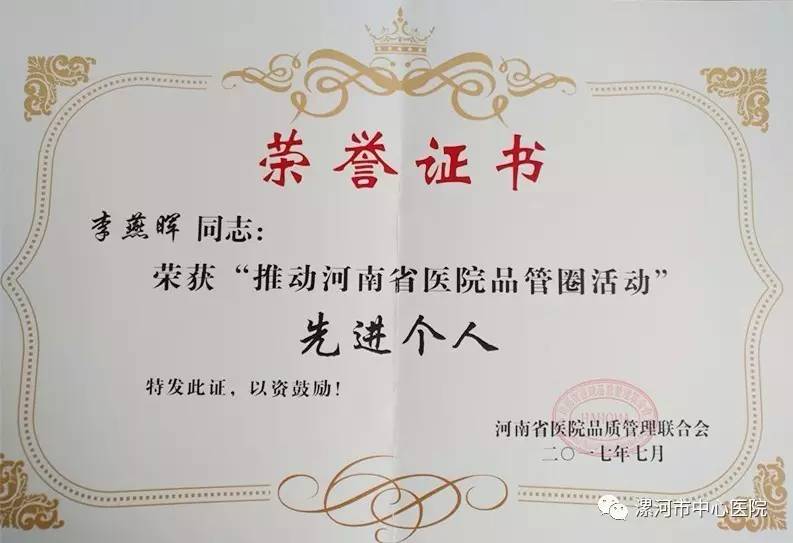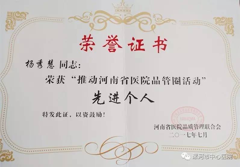 河南省医院品质管理联合会常委、我院副院长杨秀慧亲率医院3个圈组参加此次大赛,护理团队lCU“生命之树圈”、产房“呱呱落地圈”继第三届护理品管圈大赛获奖后再获殊荣,分别取得三级综合医院护理组二等奖、三等奖的好成绩,首次参赛的影像科“天添圈”以精彩的汇报夺得三级综合医院综合组二等奖,杨秀慧、李燕晖分别获得“推动医院河南省品管圈活动先进个人”荣誉称号!