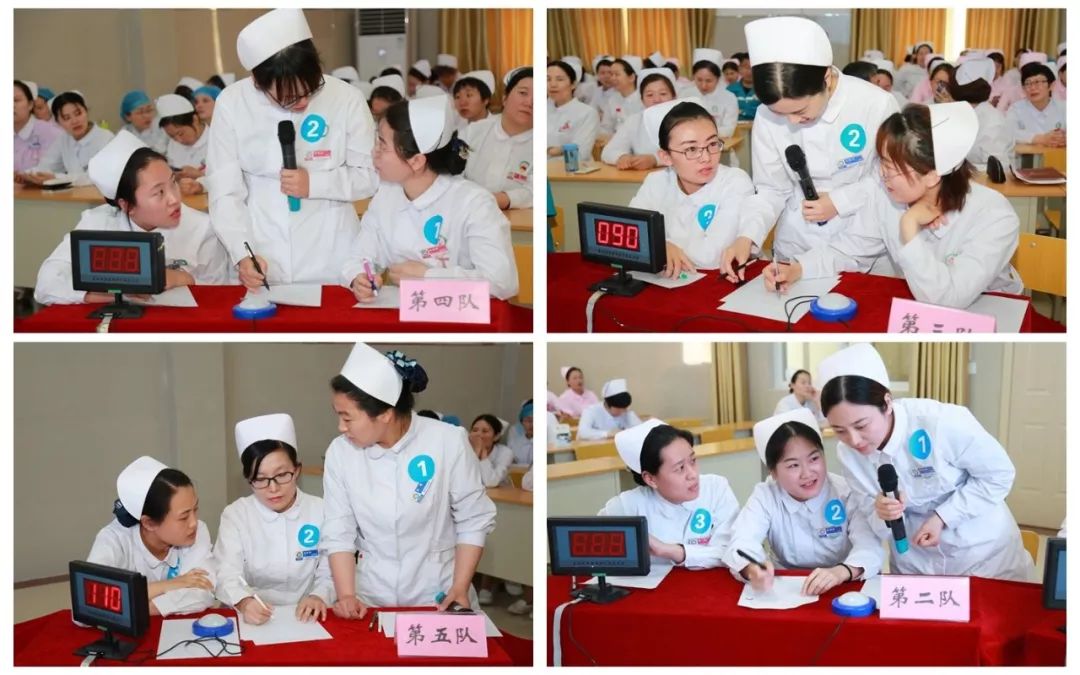 经过理论和技能两项测试,护理部从总成绩中选拔出12支优秀的代表队共36名选手进行复赛。由门诊部护士长袁媛主持,通过抢答题、必答题 、风险题三个环节进行现场打分,最终选出6支代表队18名选手进行决赛。
