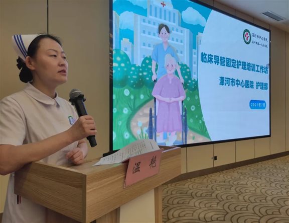 为响应国家卫健委2021年医疗质量安全改进十大目标和2020版护理专业医疗质量控制指标,进一步规范临床护理各类导管的安全固定与维护,降低导管相关血流感染和非计划性拔管率,提高静脉治疗和管道护理质量,保障患者安全,2021年7月7日~7月9日,漯河市中心医院护理部组织开展了临床导管固定护理培训工作坊,培训活动共分六场,全院临床科室近500名护理人员参加培训。培训工作坊由护理部副主任温艳主持。