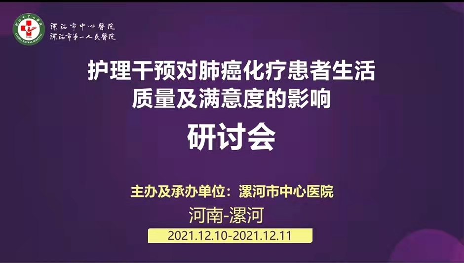 为提高漯河地区呼吸系统疾病规范化管理水平,促进护理专业稳步、健康发展;探讨如何提高肺癌患者化疗后的生活质量;加强在疫情常态化形势下,呼吸系统慢性疾病稳定期患者的居家自我管理指导。2021年12月10日至11日,由漯河市中心医院主办的“护理干预对肺癌化疗患者的生活质量及满意度影响研讨会”通过腾讯会议网络平台召开。
