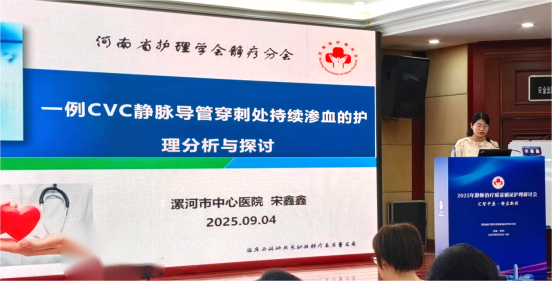 漯河市中心医院肿瘤内科一病区护师、护理学研究生宋鑫鑫投稿的《一例CVC静脉导管穿刺处持续渗血的护理分析与探讨》,从216篇论文中脱颖而出,荣获优秀论文并受邀大会发言。她从中心静脉导管概述、病例简介、护理过程与结果、总结与展望等多维度展开精彩分享,获得了在场专家与同仁的高度认可。