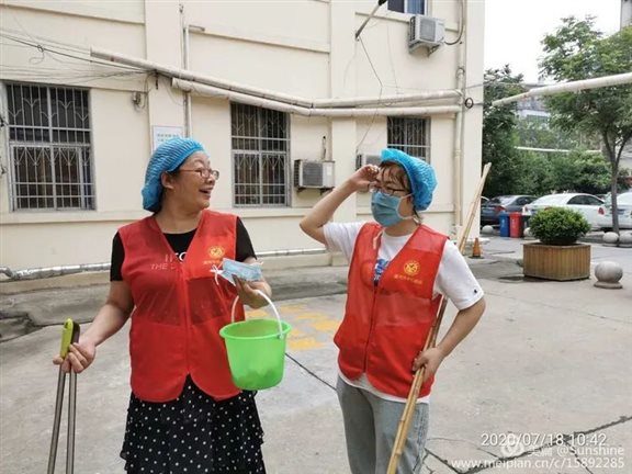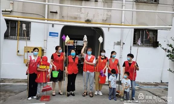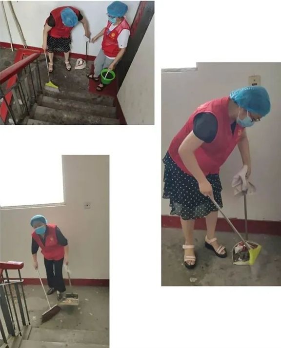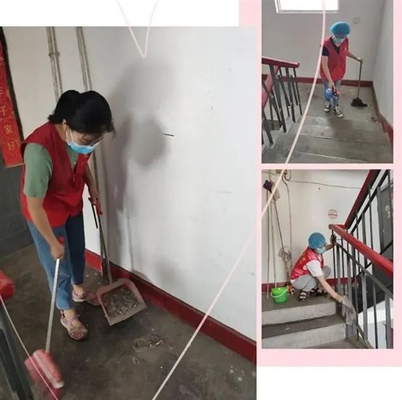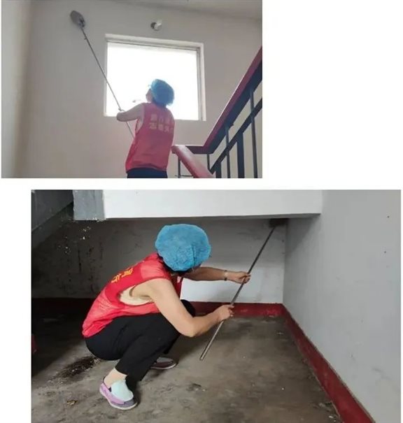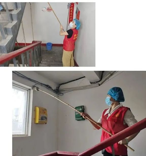 志愿服务队自制竹竿,自带水桶,毛巾,洒水器等清洁工具,每2人一组,负责小区2个单元的洒扫工作。