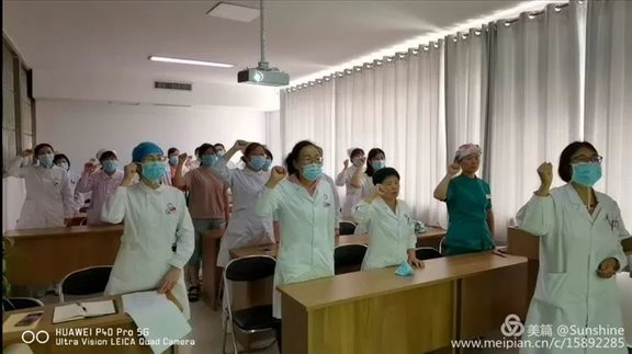全体与会党员再次重温入党誓词:作为一名共产党员,作为一医务工作者,经过疫情的洗礼,积极响应国家号召,投身防控工作中,内科一支部全体党员团结一心,锐意进取,入党誓词再次表达了我们的心声:为共产主义奋斗终身!为医护事业贡献自己的力量!