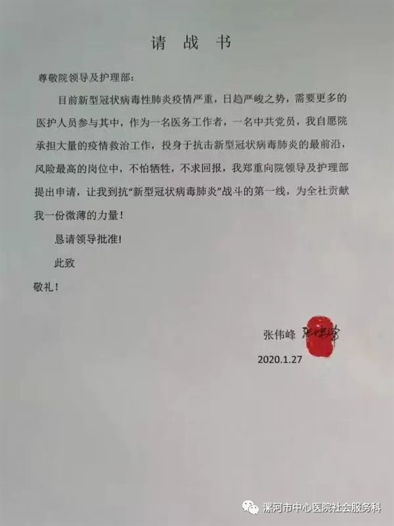 青年文明号号长、急诊科护士长张伟峰向医院及护理部递交个人申请书。