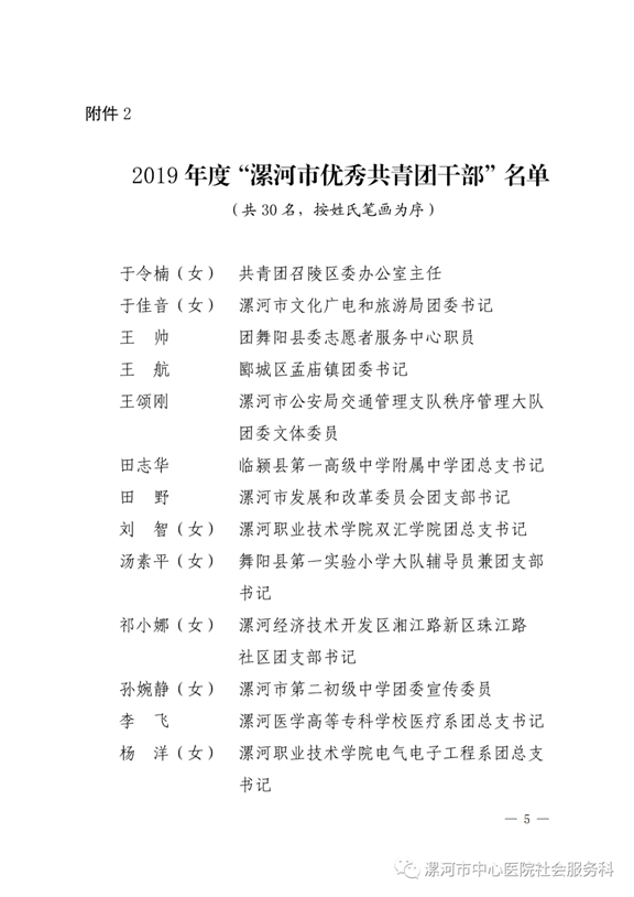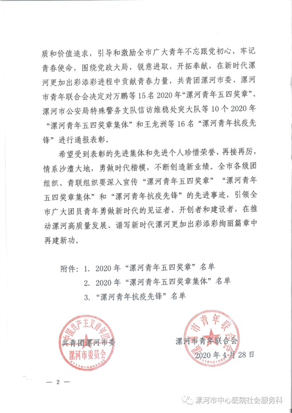 2020年4月29日,共青团漯河市委召开“漯河市纪念五四运动101周年表彰大会”,公示、表彰了“两红两优”、“漯河青年五四奖章集体”、“漯河青年五四奖章”、“漯河青年抗疫先锋”获得者。漯河市中心医院(医专一附院)周文静、张伟峰、张瑞珍、呼吸与危重症医学科分别荣获“漯河市优秀共青团干部”、“漯河市青年抗疫先锋”、“漯河青年五四奖章集体”。
