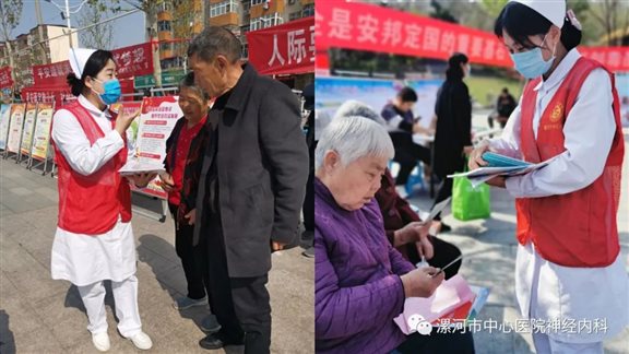 神经内科三病区护士长黄阿敏及护师王小路为前来咨询的民众发放宣传手册,并进行通俗的讲解