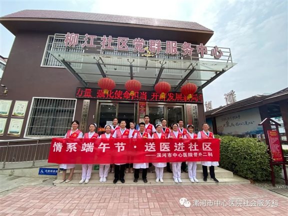 6月12日在端午节来临之际,作为“省级青年文明号”的漯河市中心医院普外二科,在刘清泉主任的带领下,秉承“健康相约,让“爱”普撒千家万户”的理念,并回馈社会各界长期以来的关心与支持,携手各相关部门,一起走进漯河市柳江小区党员服务中心,为社区内及周边地区的广大患者带去义诊咨询服务。