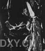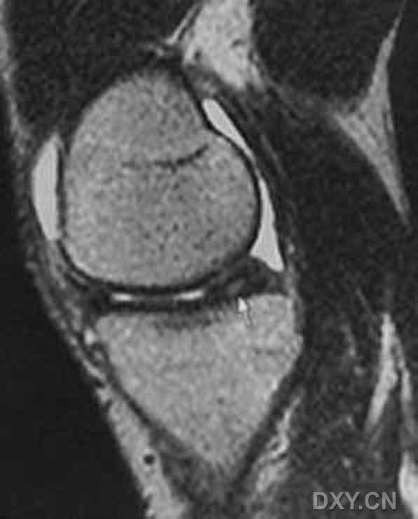 2 半月板Ⅱ级损伤即严重变性,是Ⅰ级损伤的继续。在病理上粘液样变的范围比Ⅰ级损伤要广,但是并不意味着Ⅱ级损伤一定会进展到Ⅲ级。在MRI的T2WI上表现为水平或斜行条状高信号影,未达到半月板关节面缘可达到关节囊缘。另外,要估计Ⅱ级半月板损伤的稳定性即Ⅱ级损伤进展到Ⅲ级损伤的可能性大小尚待进一步研究。
