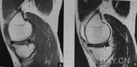 | 半月板斜行撕裂 斜行高信号影达半月板的下关节面缘 A:矢状T1 B:矢状T2