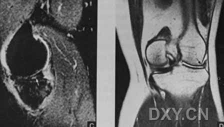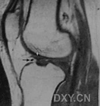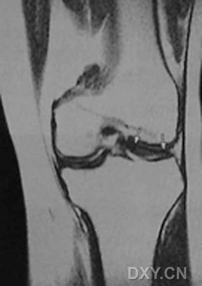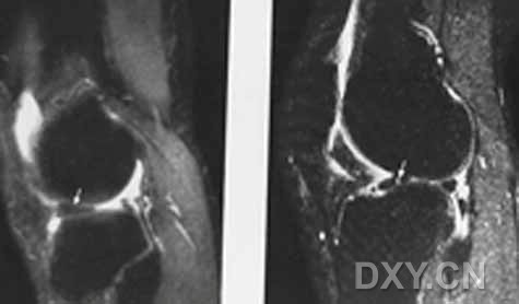 半月板撕裂分垂直型和水平型,前者多见于年轻人,因关节内液体充满撕裂口处,MRI表现撕裂处信号强度增高。水平撕裂多见于老年人,粘液样退行性变发生在半月板中央,之后形成水平撕裂,在MRI上呈高信号强度。