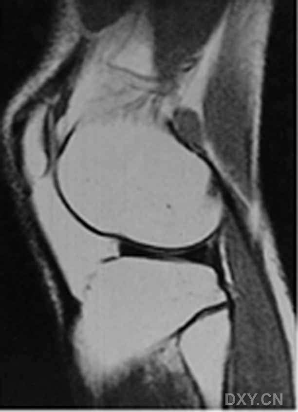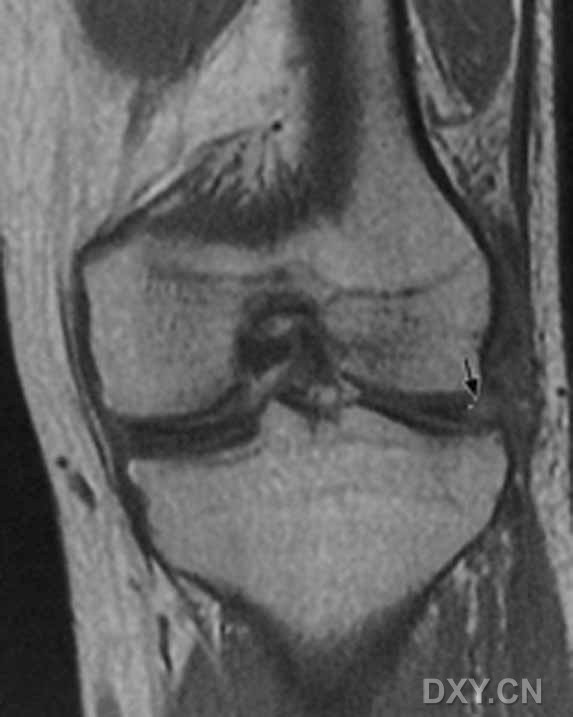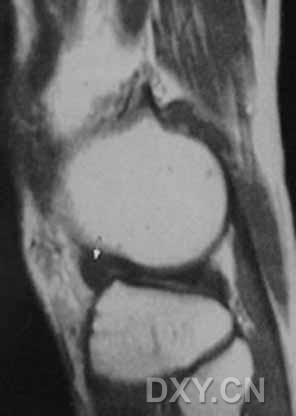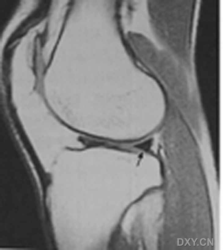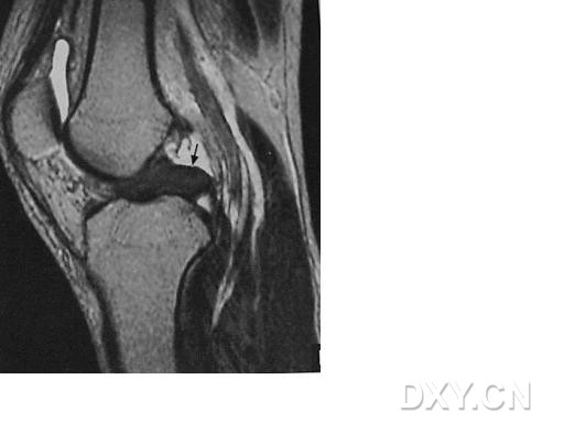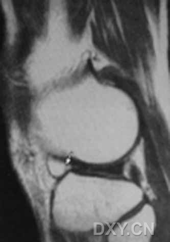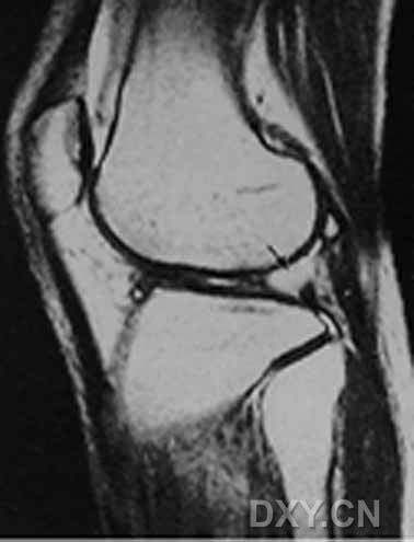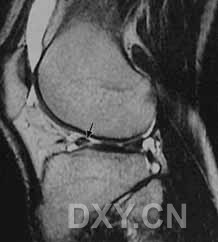 | 膝横韧带:外侧半月板前角和前方的膝横韧带间有一线形的高信号影