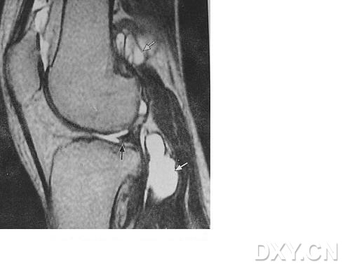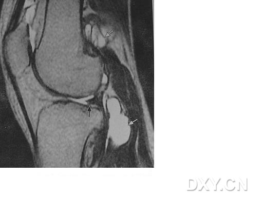 | 半月板纤毛化 外侧半月板后角内有横行的高信号影,类似半月板撕裂信号,腘窝囊肿